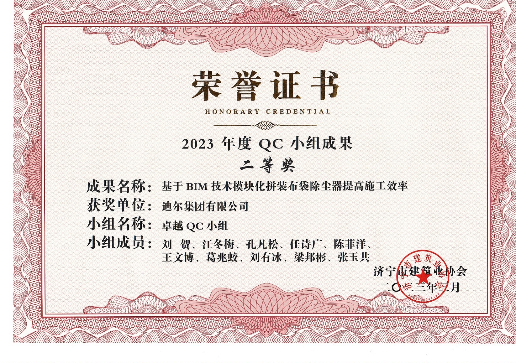 公司榮獲2023年榮獲市級QC成果基于 BIM 技術(shù)模塊化拼裝布袋除塵器提高施工效率